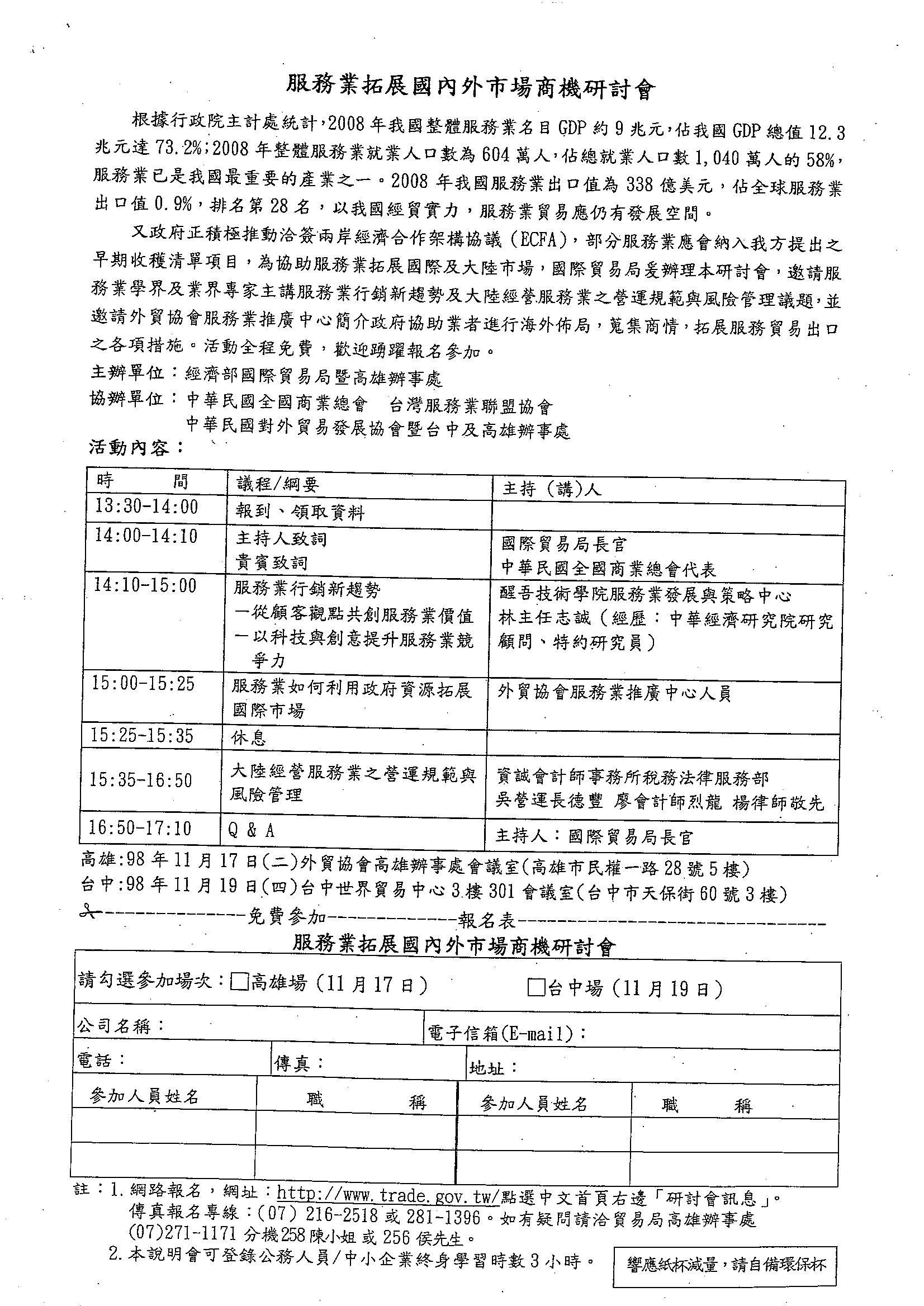 經濟部國際貿易局高雄辦事處將於11月17日及19日在高雄及台中辦理2場『服務業拓展國內外市場商機』研討會,歡迎有興趣的會員廠商自行下載報名表參加!!