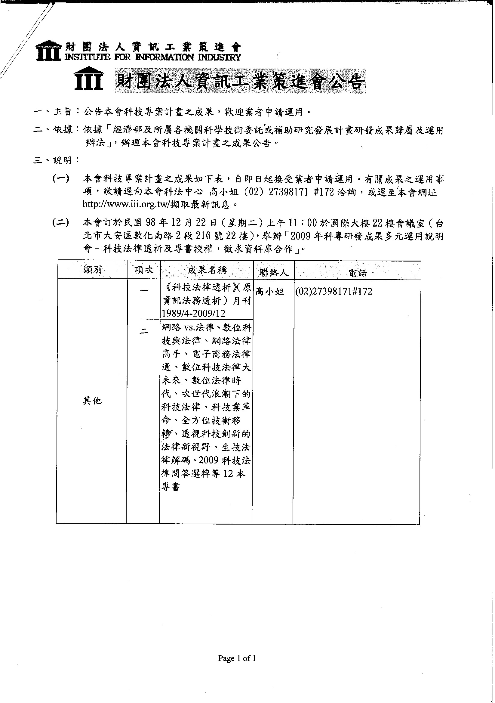 財團法人資訊工業策進會依據『經濟部及所屬各機關科學技術委託或補助研究發展計畫研發成果歸屬及運用辦法』、『經濟部推動研究機構開發產業技術辦法』公告科技專案計畫之成果(*請自行下載相關檔案)資策會訂於98年12月22日(星期二)上午11:00於國際大樓22樓會議室(台北市大安區敦化南路2段216號22樓)舉辦『2009年科專研發成果多元運用說明會-科技法律透析及專書授權,徵求資料庫合作』有關資策會成果之運用事項,敬請會員廠商逕向資策會科技法律中心高小姐洽詢,聯絡電話02-2739-8171分機172或逕至資策會網站擷取最新訊息
