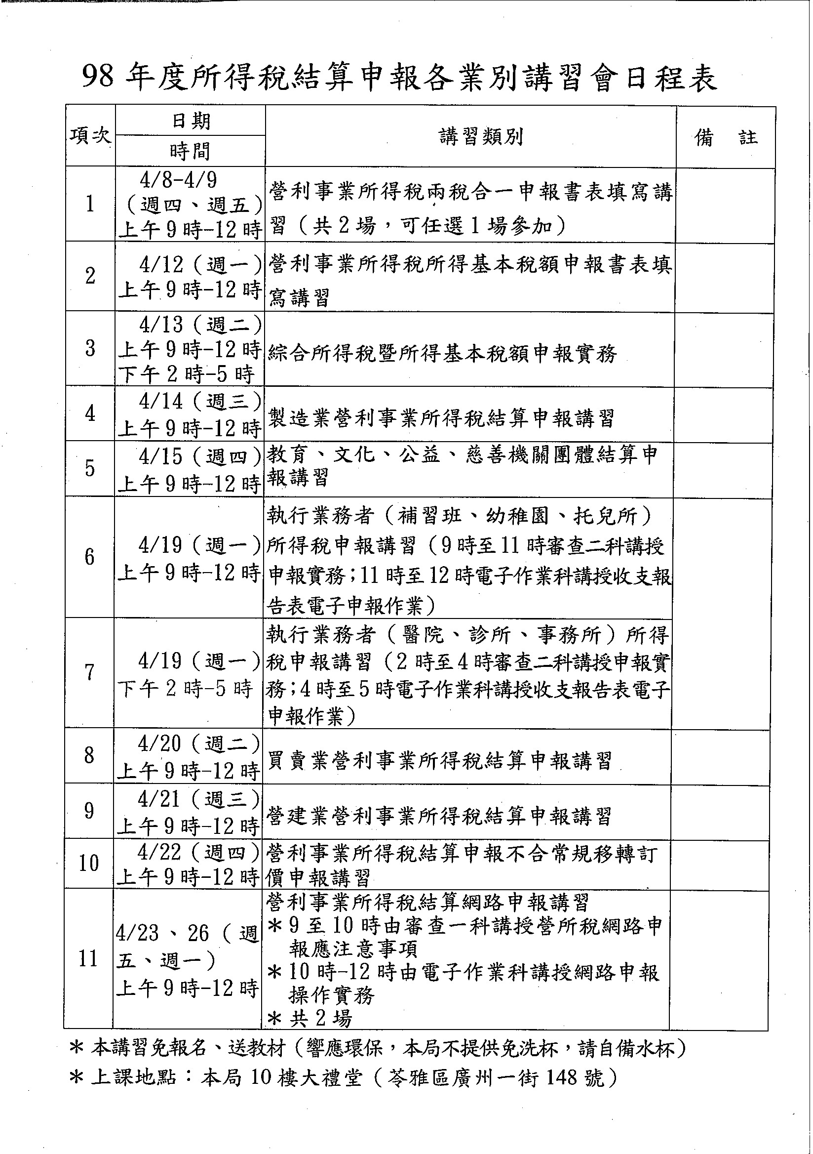 財政部高雄市國稅局為輔導高雄市各營利事業順利辦理所得稅結算申報及帳務處理,特舉辦『營利事業兩稅合一申報書表填寫』、『所得基本稅額申報書表填寫』及『98年度所得稅結算申報各業別講習會』,課程免報名、送教材,檢附講習會日程表一份,歡迎有興趣之會員廠商踴躍前往參加!(*各講習會日程表請自行下載相關文件參考)