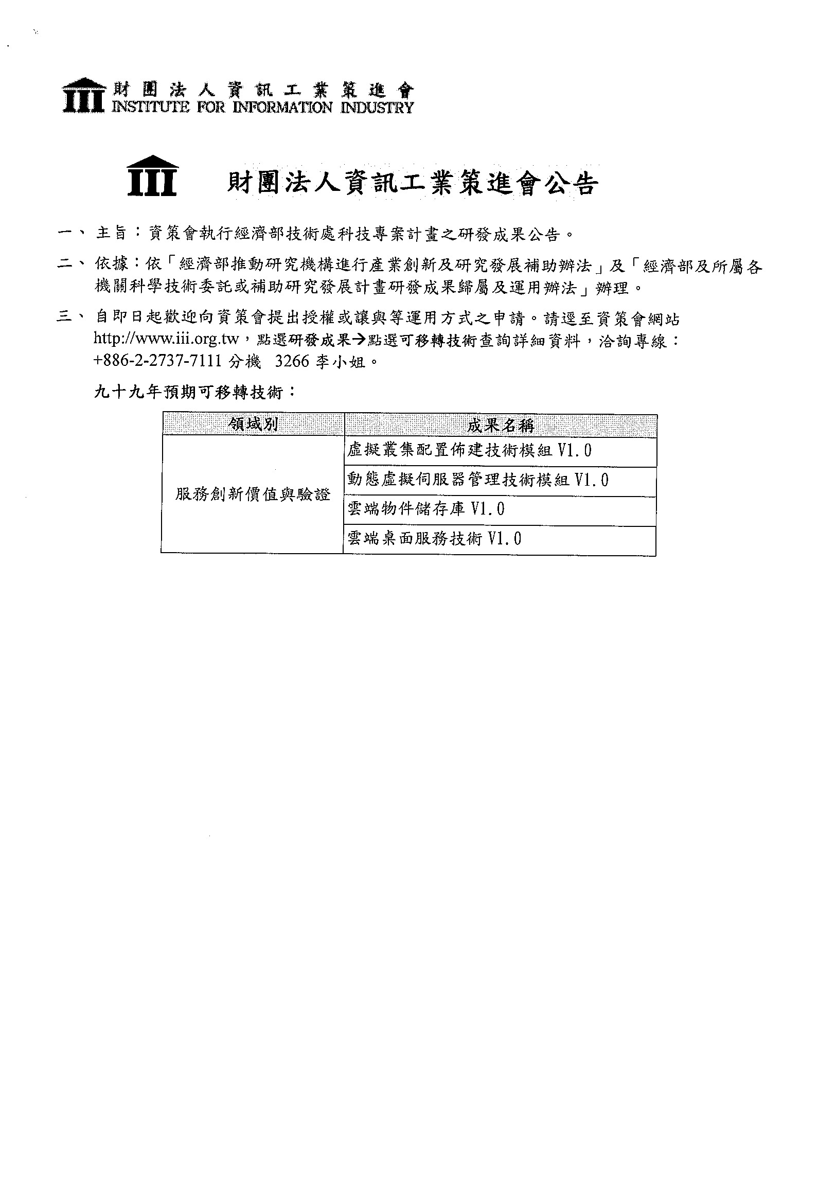 一.財團法人資訊工業策進會依據『經濟部推動研究機構進行產業創新及研究發展補助辦法』及『經濟部及所屬各機關科學技術委託或補助研究發展計畫研發成果歸屬及運用辦法』辦理。二.資策會為加速對業界之服務,即日起接受業者申請技術移轉。歡迎業者向資策會提出授權或讓與等運用方式之申請。三.相關資料請自行下載相關文件並上資策會網站查詢