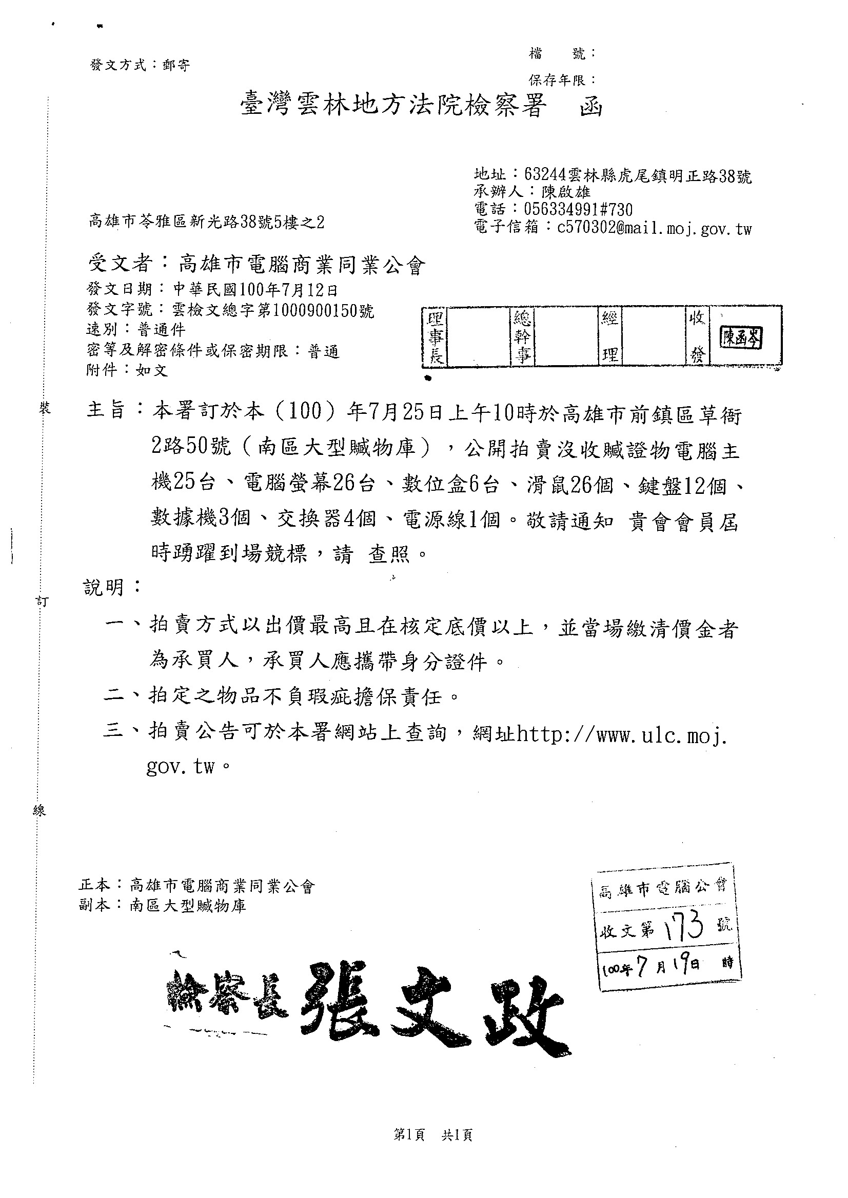 主旨:高雄市前鎮區草衙2路50號(南區大型贓物庫)公開拍賣沒收贓證物電腦主機25台.電腦螢幕26台.數位盒6台.滑鼠26個.鍵盤12個.數據機3個.交換器4個.電源線1個.歡迎會員踴躍到場競標