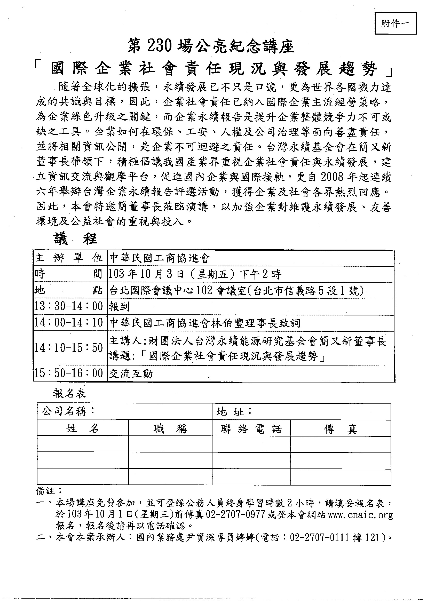 【轉發】中華民國工商協進會-第230場「公亮紀念講座」-國際企業社會責任現況與發展趨勢