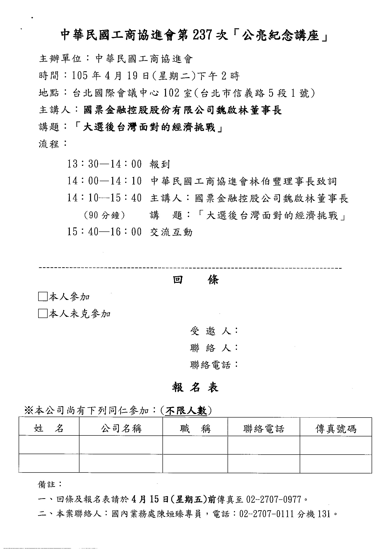 【轉發】中華民國工商協進會-第237次公亮紀念講座「大選後台灣面對的經濟挑戰」