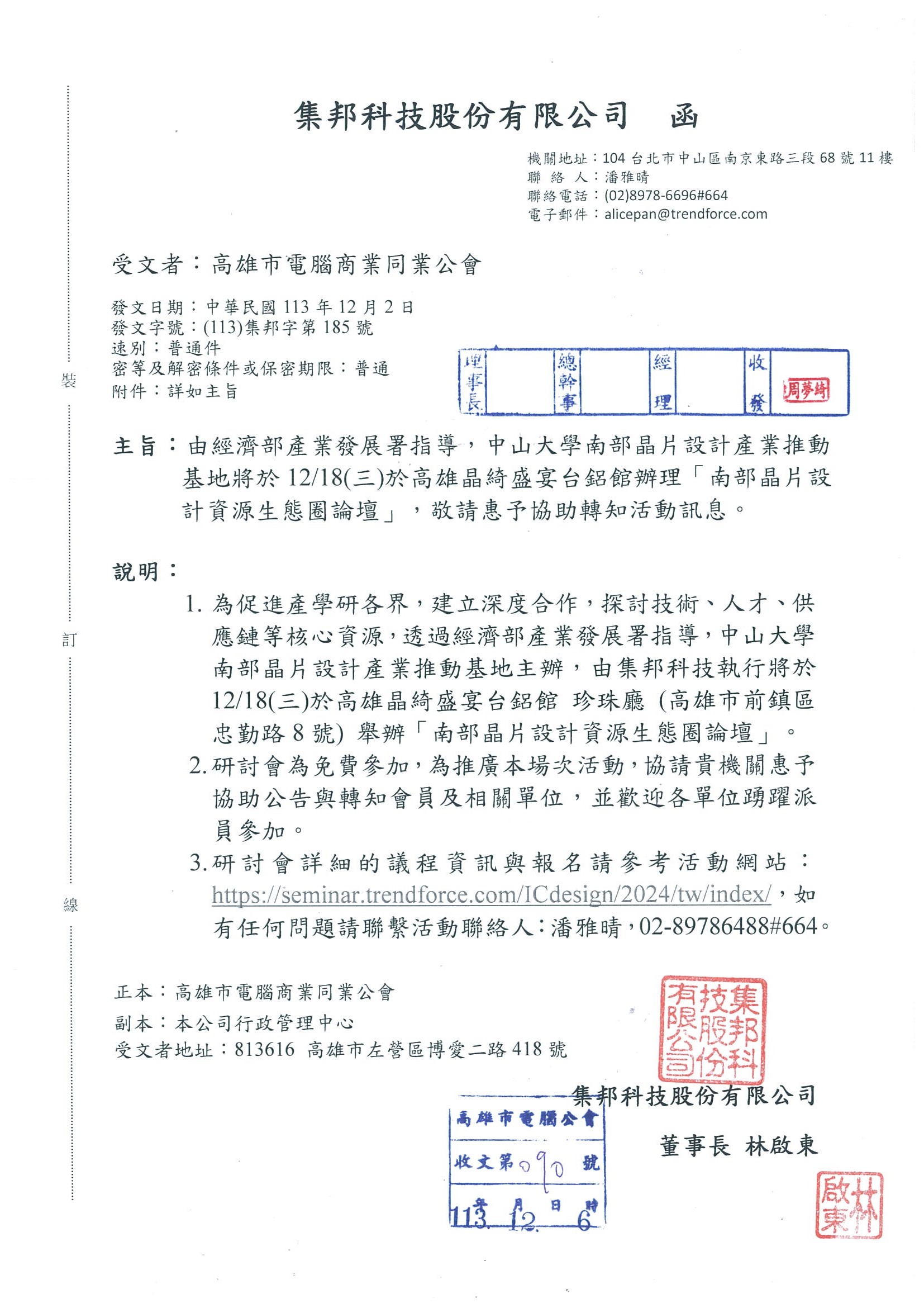 【轉發】集邦科技股份有限公司函文-經濟部產發署指導,中山大學南部晶片設計產業推動基地將於12/18於高雄晶綺盛宴台鋁館辦理南部晶片設計資源生態論壇,歡迎會員參加